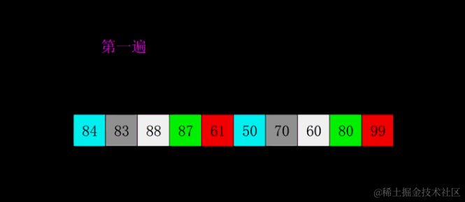 - 3: 针对所有的元素重复以上的步骤,除了最后一个