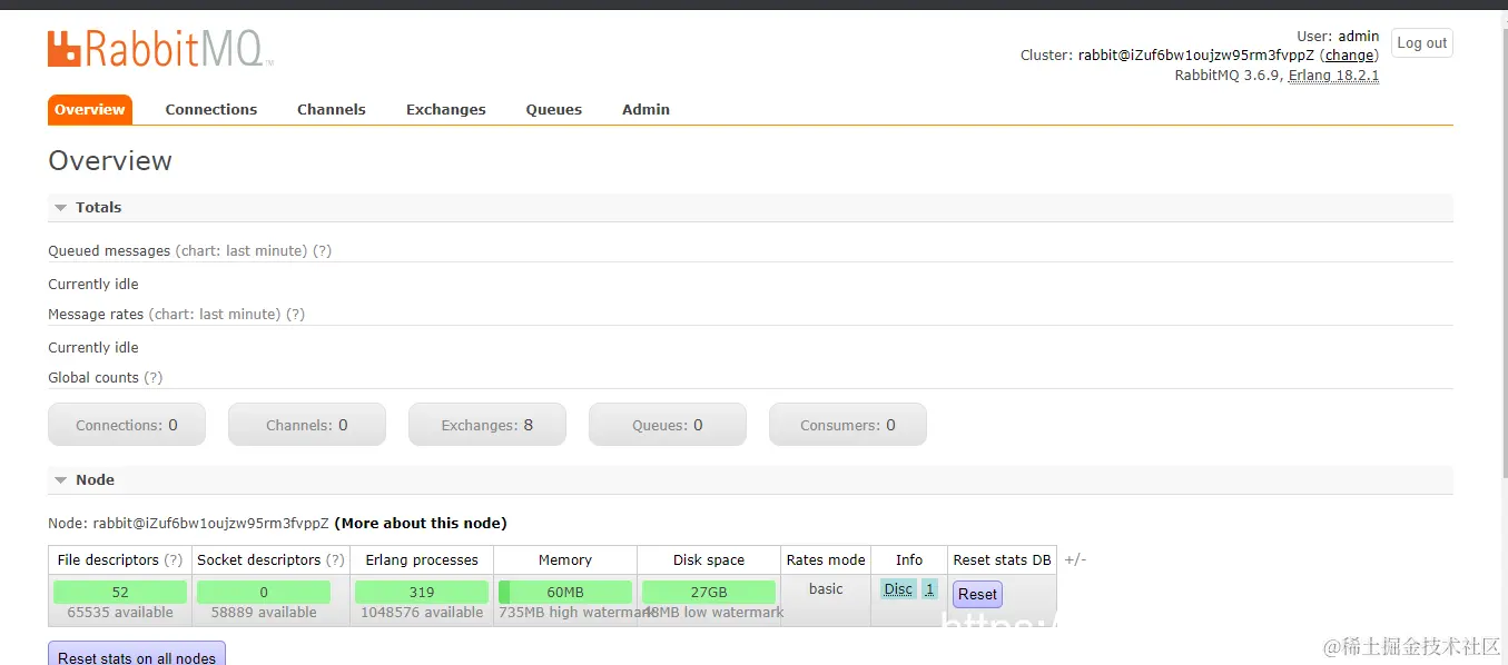 可登陆管理控制台(启用management plugin的情况下),同时可以查看rabbitmq节点的相关信息(进程数,内存使用情况,磁盘使用情况等)