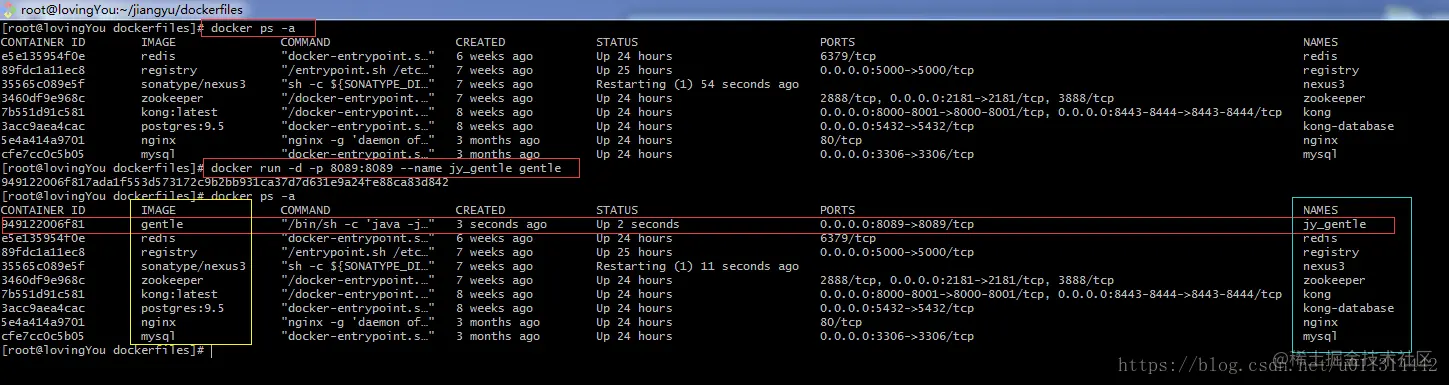 从第 2 次查看可知容器已成功启动。黄框中的是各个容器使用的镜像的名字,蓝框中的是各个容器的名字。