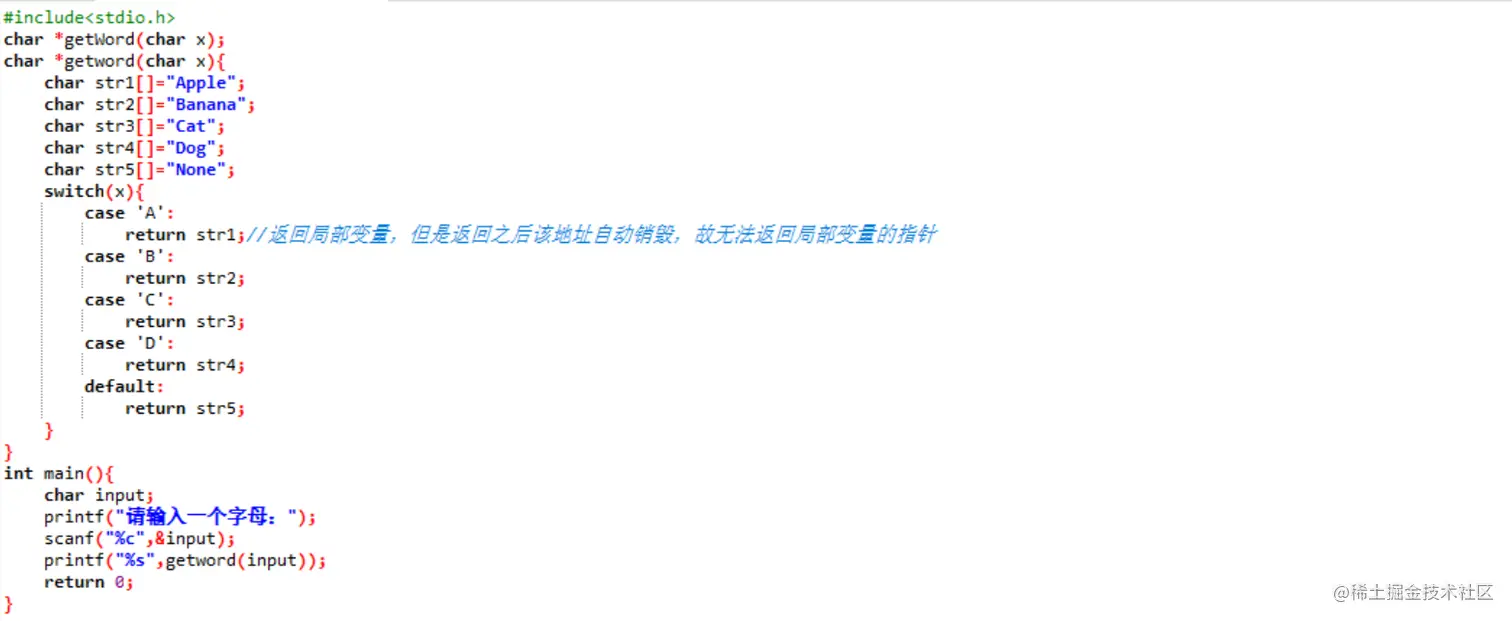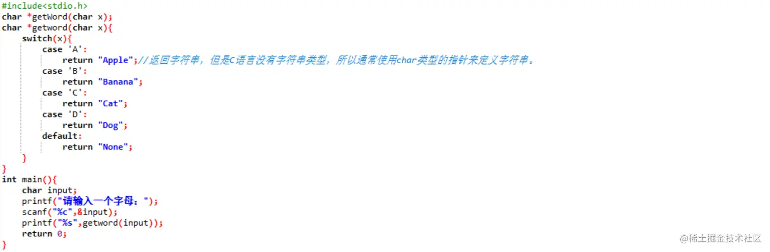 - 注意:想要调用函数返回字符串,但是C语言没有字符串类型,所以通常使用char类型的指针来定义字符串。(因为char类型的指针指向一个字符的地址,使用该类型指向字符串的第一个字符地址,字符串约定截止为空字符‘\0’,所以知道第一个字符就知道了整个字符串,这是由字符串的性质决定的。)