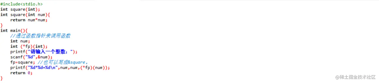 - 注意:理解为函数名=数组名=首地址,这里将fp赋值为square的地址,*fp则代表这个函数。类似于数组
