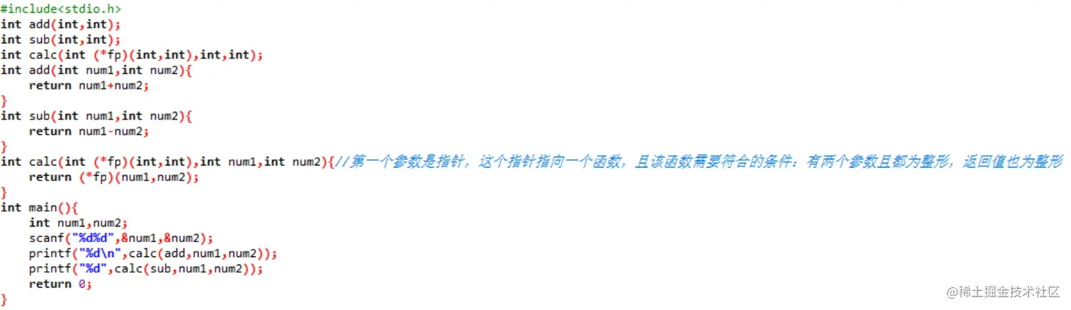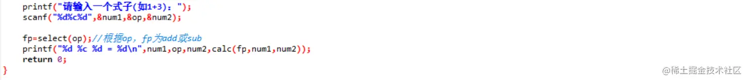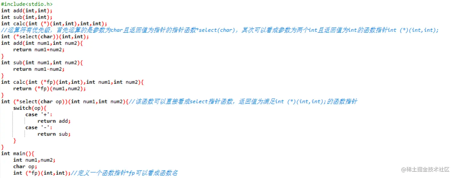 - int (select(char op))(int num1,int num2){}//该函数可以直接看成select指针函数,返回值为满足int ()(int,int);的函数指针