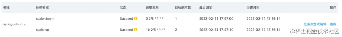 我们在 spring-cloud-c 应用开启了定时HPA 模拟应用启动的过程,每隔5分钟做一次伸缩,在第2分钟第0秒缩容到1个节点,在第2分钟第10秒扩容到2个节点。