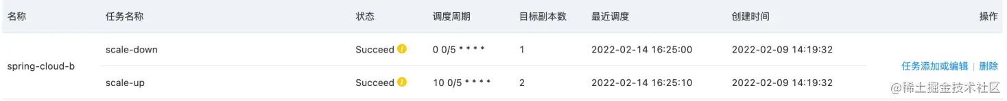 由于我们对spring-cloud-b跟spring-cloud-b-gray应用均开启了定时HPA,模拟每5分钟进行一次定时的扩缩容。
