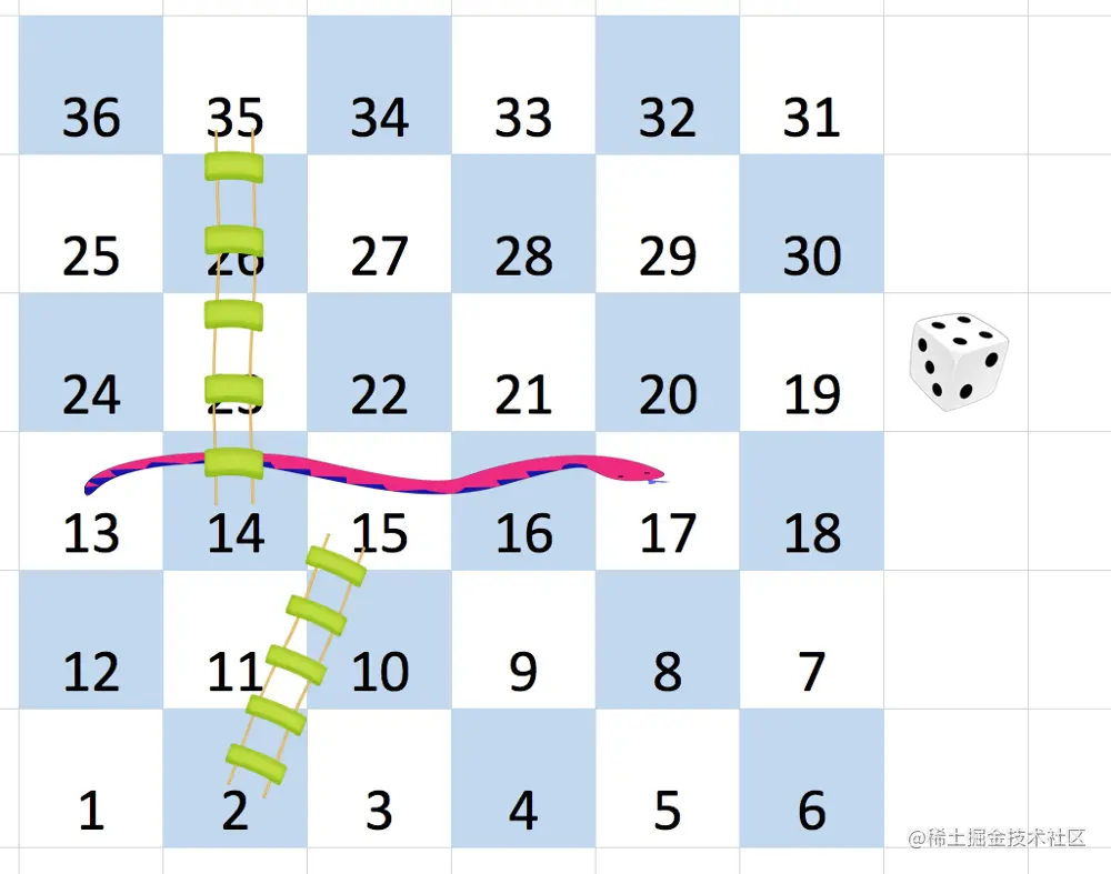 注意,玩家在每回合的前进过程中最多只能爬过蛇或梯子一次:就算目的地是另一条蛇或梯子的起点,玩家也 不能 继续移动。