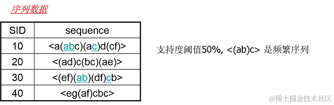 而频繁序列则和我们的频繁项集很类似,也就是频繁出现的子序列。比如对于下图,支持度阈值定义为50%,也就是需要出现两次的子序列才是频繁序列。而子序列<(ab)c>是频繁序列,因为它是图中的第一条数据和第三条序列数据的子序列,对应的位置用蓝色标示。