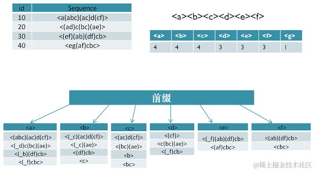 同样的方法可以得到其他以<a>, <b>, <c>, <e>, <f>为前缀的频繁序列。