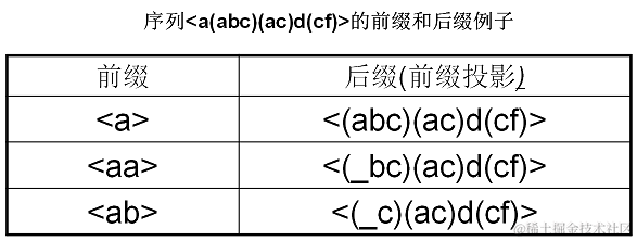 看了前缀,我们再来看前缀投影,其实前缀投影这儿就是我们的后缀,有前缀就有后缀嘛。前缀加上后缀就可以构成一个我们的序列。下面给出前缀和后缀的例子。对于某一个前缀,序列里前缀后面剩下的子序列即为我们的后缀。如果前缀最后的项是项集的一部分,则用一个“_”来占位表示。
