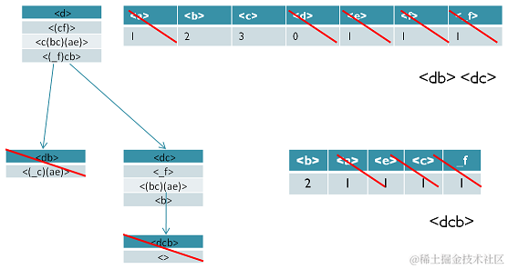 现在我们开始挖掘频繁序列,分别从长度为1的前缀开始。这里我们以d为例子来递归挖掘,其他的节点递归挖掘方法和D一样。方法如下图,首先我们对d的后缀进行计数,得到{a:1, b:2, c:3, d:0, e:1, f:1,_f:1}。注意f和_f是不一样的,因为前者是在和前缀d不同的项集,而后者是和前缀d同项集。由于此时a,d,e,f,_f都达不到支持度阈值,因此我们递归得到的前缀为d的2项频繁序列为<db>和<dc>。接着我们分别递归db和dc为前缀所对应的投影序列。首先看db前缀,此时对应的投影后缀只有<_c(ae)>,此时_c,a,e支持度均达不到阈值,因此无法找到以db为前缀的频繁序列。现在我们来递归另外一个前缀dc。以dc为前缀的投影序列为<_f>, <(bc)(ae)>, <b>,此时我们进行支持度计数,结果为{b:2, a:1, c:1, e:1, _f:1},只有b满足支持度阈值,因此我们得到前缀为dc的三项频繁序列为<dcb>。我们继续递归以<dcb>为前缀的频繁序列。由于前缀<dcb>对应的投影序列<(_c)ae>支持度全部不达标,因此不能产生4项频繁序列。至此以d为前缀的频繁序列挖掘结束,产生的频繁序列为<d><db><dc><dcb>。