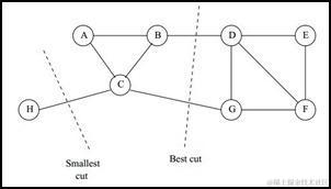 我们选择一个权重最小的边缘的点,比如C和H之间进行cut,这样可以最小化 cut(A1,A2,...Ak) cut(A1,A2,...Ak), 但是却不是最优的切图,如何避免这种切图,并且找到类似图中"Best Cut"这样的最优切图呢?我们下一节就来看看谱聚类使用的切图方法。