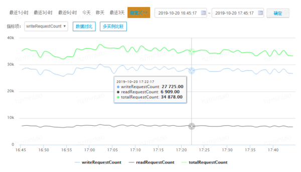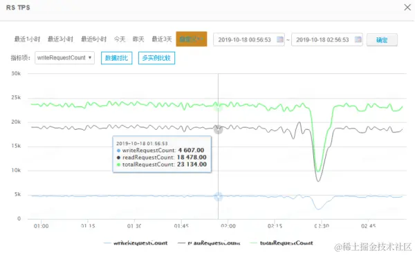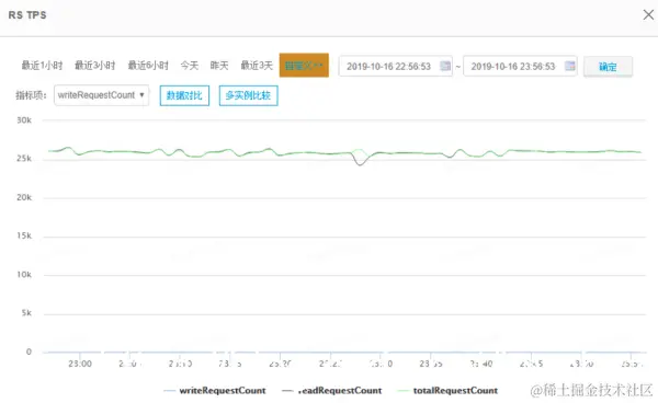 - 吞吐量曲线说明:单个实例节点稳定在2.5W左右,整个集群2台物理机稳定在10W左右,单台物理机基本稳定在5W左右。