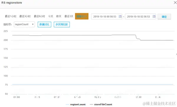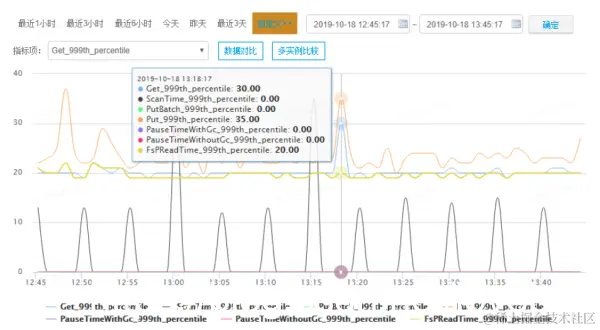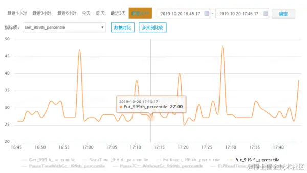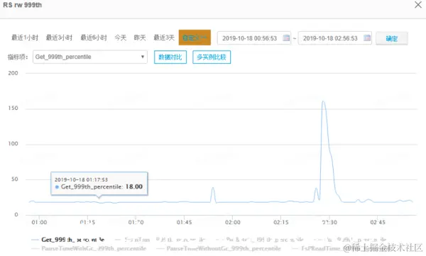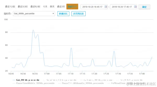 很明显,在2点28分~2点32分之间减少了十几个HFile文件,很容易就猜测到RegionServer执行了compaction操作导致网络带宽和硬盘IO有一个明显的消耗,导致了随机读P999飙升。不过,HBase可以通过将hbase.regionserver.throughput.controller设置为org.apache.hadoop.hbase.regionserver.compactions.PressureAwareCompactionThroughputController开启compaction的限流功能,通过参数hbase.hstore.compaction.throughput.higher.bound限制compaction执行过程中的最大使用网络带宽。