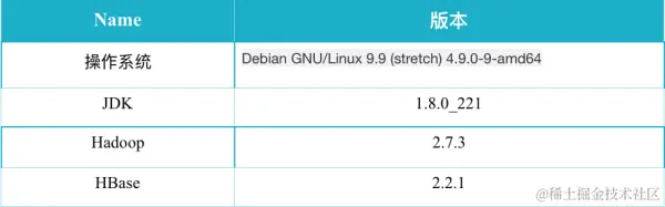 本次测试中,测试环境总共包含3台物理机作为Hadoop数据存储,其中2台物理机作为RegionServer部署宿主机,每个宿主机上起2个RegionServer节点,整个集群一共4个RegionServer节点。生成数据的YCSB程序与数据库并不运行在相同的物理集群。