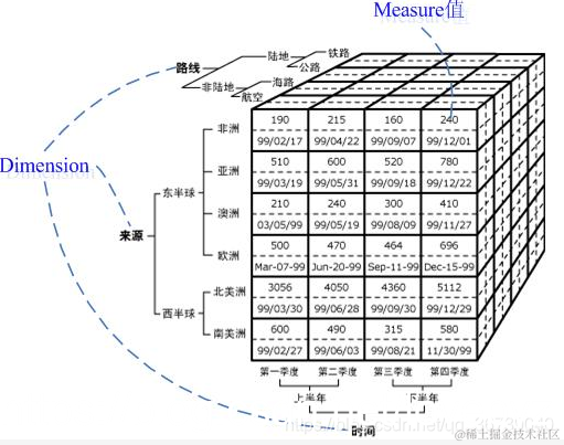 **维的层次(Lever): **表示维度概念基础上进一步的细分,如时间可以细分为年、季度、月三个层次。
