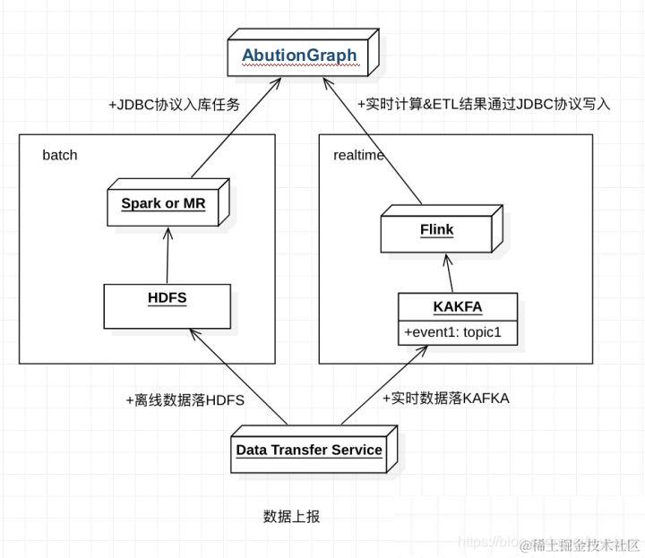 - **离线: **数据落地HDFS ODS层,离线通过Spark或MR的batch形式批量导入到AButionGraph中