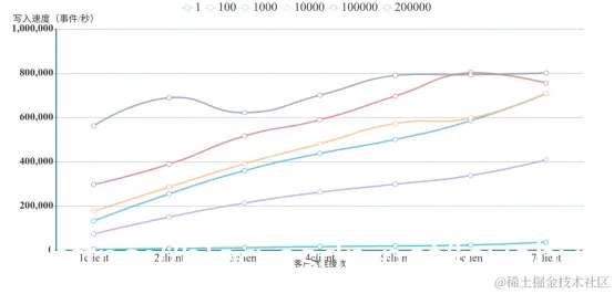 | 事件数 | 1client | 2client | 3client | 4client | 5client | 6client | 7client |