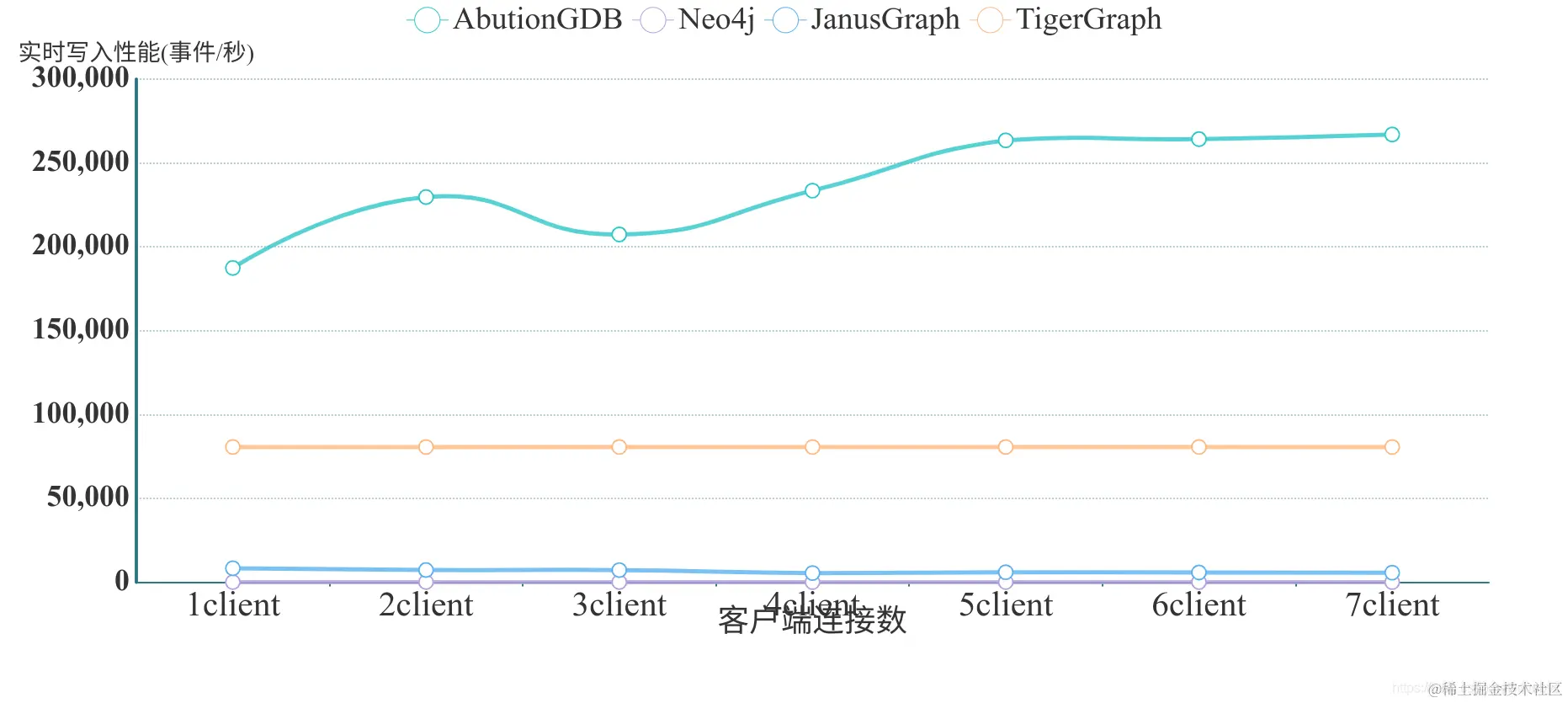 综上所述,AbutionGDB在多客户端连接同步写入的速度远远高于同等条件下的TigerGraph、JanusGraph和Neo4j等市场主流图数据库。AbutionGDB在7个客户端连接同时写入的情况下可达到~270,000事件记录/秒的写入速度(约810,000条实体与关系),是已测得JanusGraph的最大写入速度的33倍,是TigerGraph普通接口最大写入速度的222倍,是Neo4j最大写入速度的3709倍。