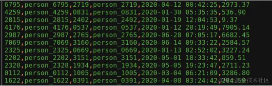 测试采用的数据来源于互联网的消费/转账记录模拟数据,每行记录包含6个字段,分别是:付款方帐号(4bytes长整型)、付款方名字(11bytes字符串)、收款方帐号(4bytes长整型)、收款方名字(11bytes字符串)、交易时间(7bytes日期类型)、交易金额(8bytesBigdicemal双精度浮点数),数据长度最低是45bytes,因为交易金额的长度是个不确定的值。数据样例如下: