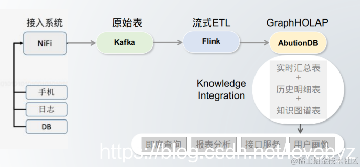 从架构上可以看到,AbutionGraph合并了输出存储端,这是因为Abution中同时具有多种数据库的建模方式,可以在一个数据库中实现所有存储模型,实时汇总表(聚合模型-代替Druid的报表分析,且是多维度的)、历史明细表(静态模型-代替Hbase/MySQL,存储历史明细)、知识图谱表(图模型,天生的用户画像模型,代替ES的搜索-关联实时汇总表与历史明细表)。
