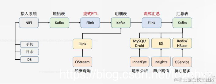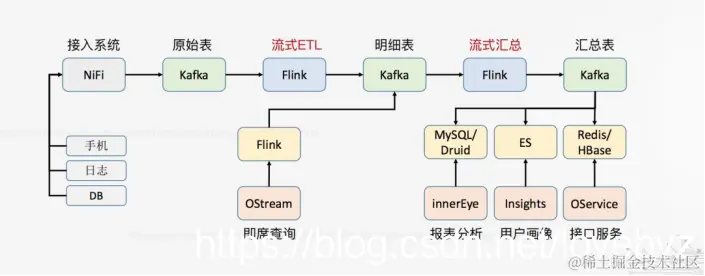 采用Kafka+Flink+Druid/ES/Hbase构建实时数仓可能是过去一年看到非常主流的实时数仓建设方案了,端到端的实时流处理,一端是采集到的原始数据(Kafka),另一端是报表/标签/接口这些对数据的呈现与应用(Druid/ES/Hbase),连接两端的是中间实时流(Flink)。更优化的端到端,源表是Kafka,目标表也是Kafka,统一经过Kafka后再导入到HBase。下图来自Flink推文: