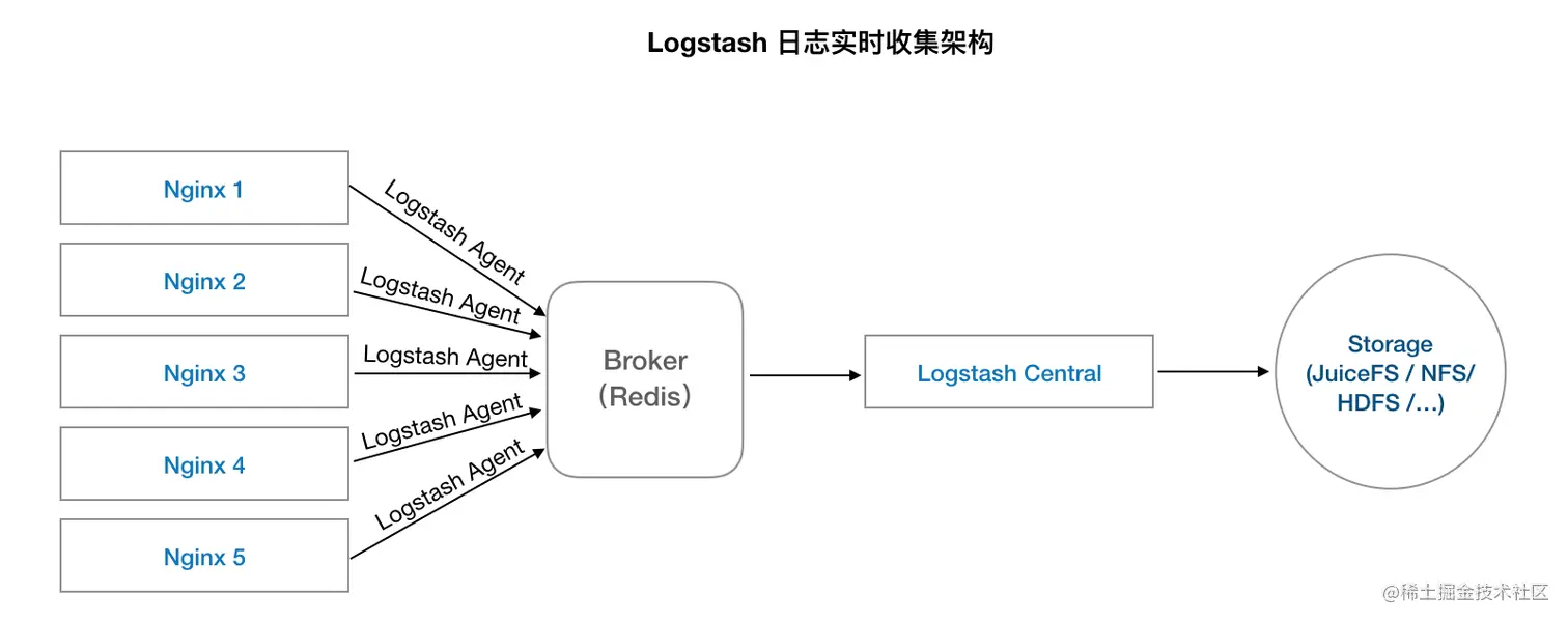 - 在每台机器上部署一个 Logstash Agent(Flume 等其他工具同理);