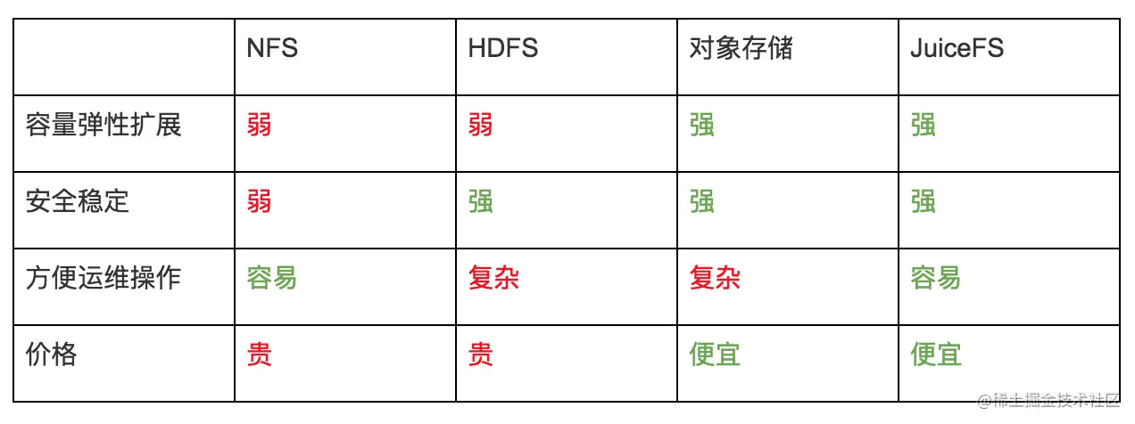 在日志的存储上需要里,容量扩展性强,稳定安全,方便运维操作,价格便宜,最好按使用量付费是重点,对于存储性能的要求会低一些。目前常用的有 NFS、HDFS、对象存储等,把这些存储与 JuiceFS 做个比较:
