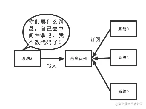 将消息写入消息队列,需要消息的系统自己从消息队列中订阅,从而系统A不需要做任何修改。