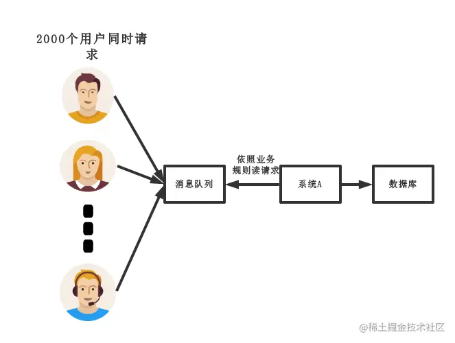 系统A慢慢的按照数据库能处理的并发量,从消息队列中慢慢拉取消息。在生产中,这个短暂的高峰期积压是允许的。