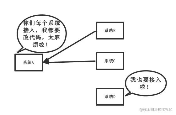 系统间耦合性太强,如上图所示,系统A在代码中直接调用系统B和系统C的代码,如果将来D系统接入,系统A还需要修改代码,过于麻烦!