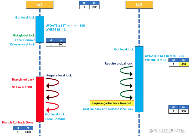 - 拿 全局锁 的尝试被限制在一定范围内,超出范围将放弃,并回滚本地事务,释放本地锁。