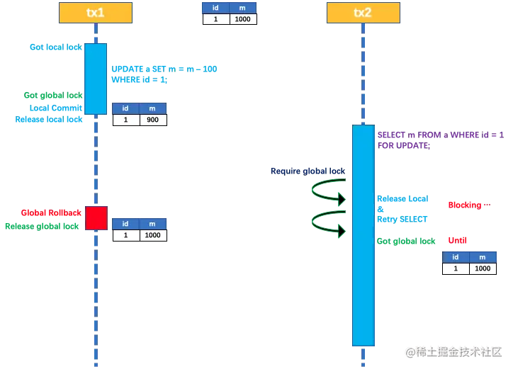 - 一阶段本地事务提交前,需要确保先拿到 全局锁 。