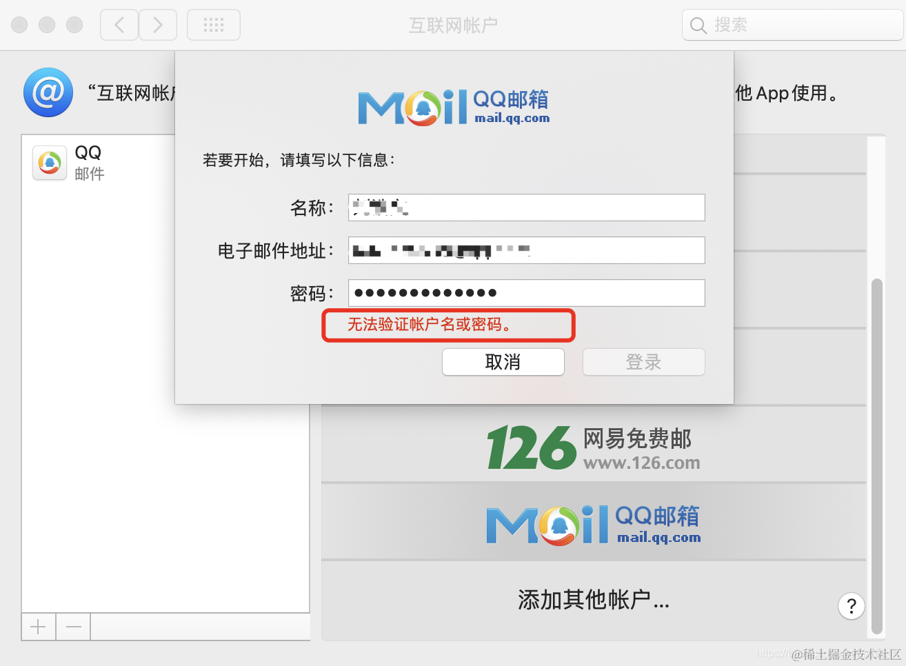 MacOS添加QQ邮箱 显示无法验证账户名或密码 HelloBug_ 2022-02-23 242 阅读1分钟 这是因为密码需要填写的不是真实密码,而是授权码 网页登陆QQ邮箱,选择设置—账户—POP3/IMAP/SMTP/Exchange/CardDAV/CalDAV服务— 开启IMAP/SMTP服务(需要使用绑定邮箱的手机号发送一条短信进行开启配置,之后会有一个授权码)——电子邮件地址填写邮箱地址,密码填写授权码即可