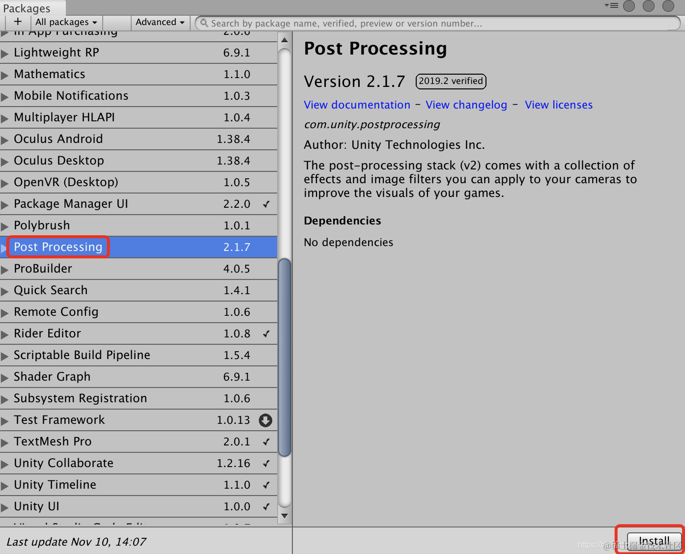 ——使用Package Manager安装PostProcessing插件(Package Manager一直loading的话,断开网络之后重新打开项目选择Package Manager,插件列表就会显示出来了,之后再连接网络进行安装)