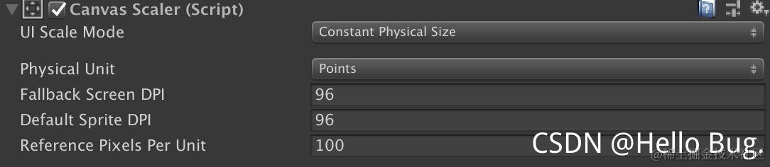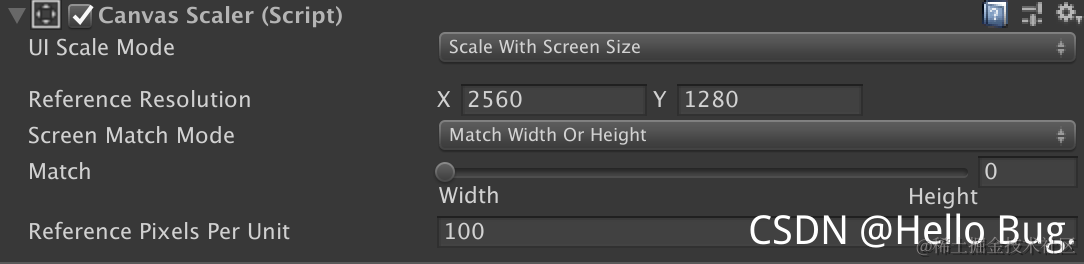 在此模式下,无论屏幕分辨率尺寸大小怎么变化,UI像素保持不变,想要实现不同分辨率下的适配需要调整Scale Factor数值(Scale With Screen Size的实现原理)