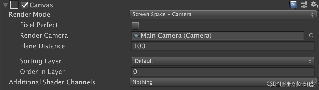 在这种模式下Canvas的x轴和y轴坐标就是指定Camera的x和y坐标,z轴坐标是指定Camera的z坐标+Canvas组件的Z坐标(Plane Distance属性数值)