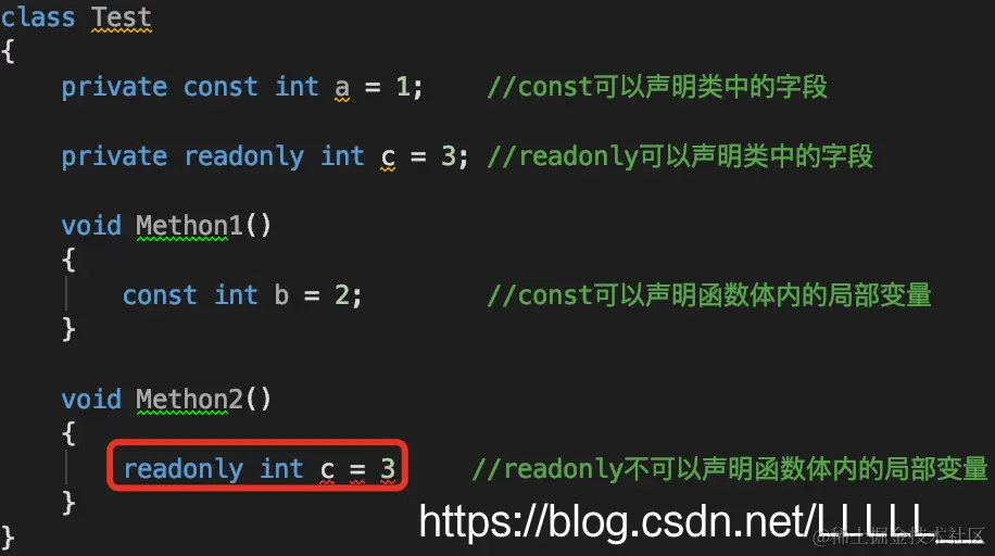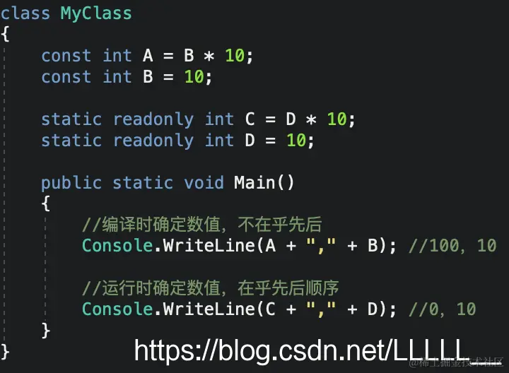 所以const声明的常量只能通过类去访问,readonly声明的常量访问方式需要看是否有static关键字