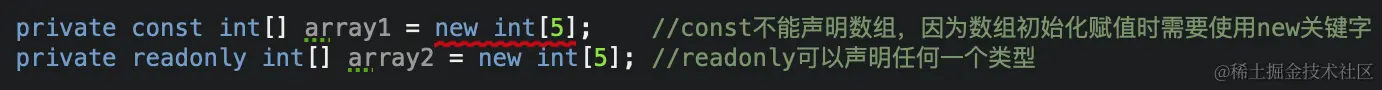 ——const只能声明不用new初始化的值类型(int,double),所以数组、结构体类型不能声明为const,但是string可以,因为.net框架内部对string进行了特殊处理,使string具有恒定性,使它是只读的