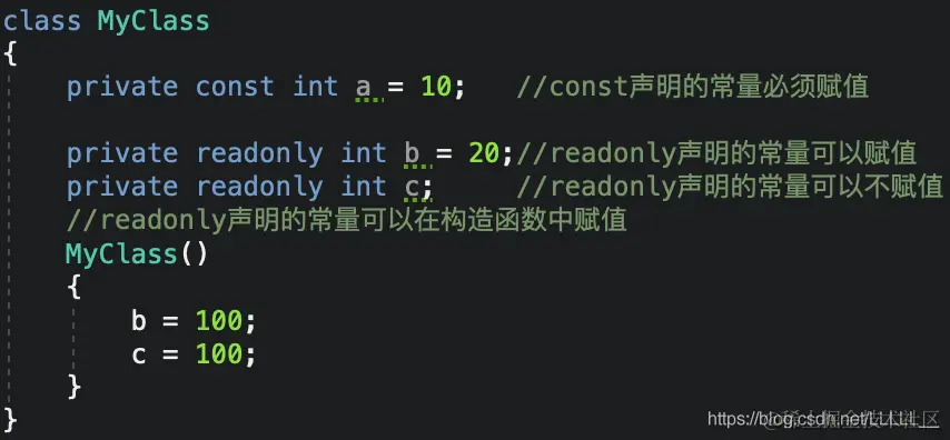 readonly声明的时候可以赋值也可以不赋值,也可以在类的构造函数中进行赋值(如果是静态动态常量static readonly则可以在静态构造函数中初始化)