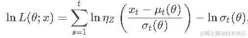 最大似然(ML)参数估计是所有讨论模型的选择方法,因为转换密度,即给定过去信息的 X_t 的密度是明确已知的。因此,过程样本路径 x 的对数似然函数由下式给出