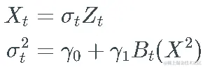 在 ARCH 过程中,波动性具有简化形式,对于所有 i,λi = 0,并且 。