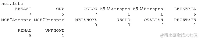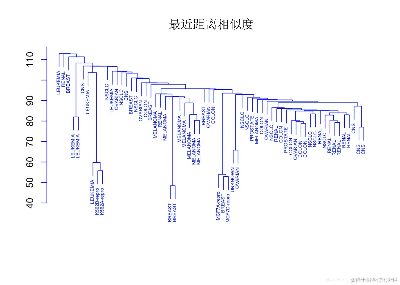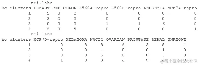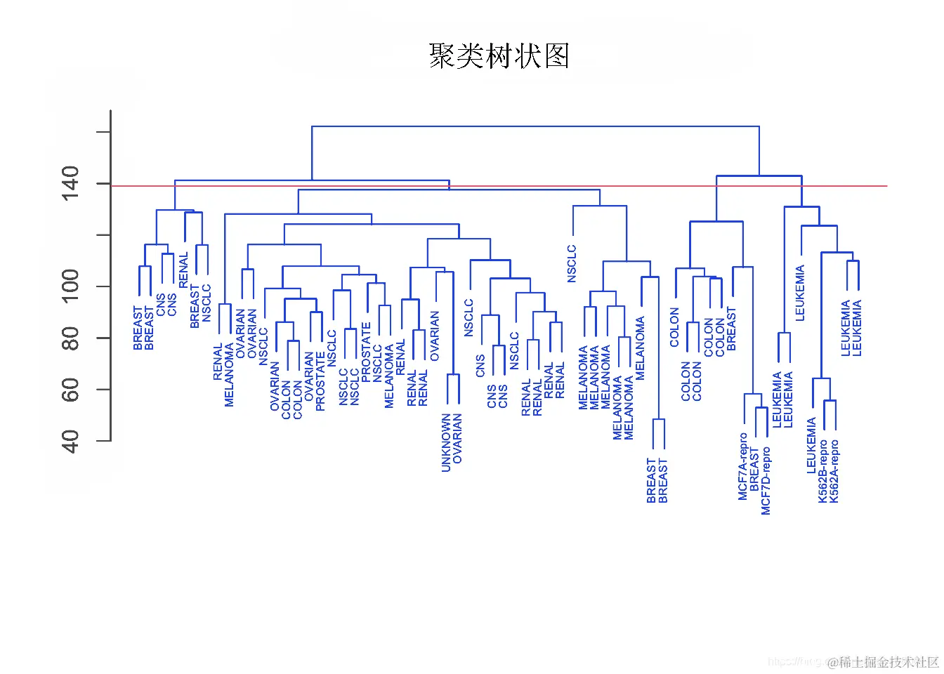 我们可以看到一个清晰的模式,即所有白血病细胞系都属于聚类 3,其中乳腺癌细胞分布在三个不同的聚类中。