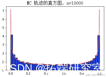 是马尔可夫链的平稳分布。我们用马尔可夫链的单个轨迹所取值的直方图来检查这个属性。