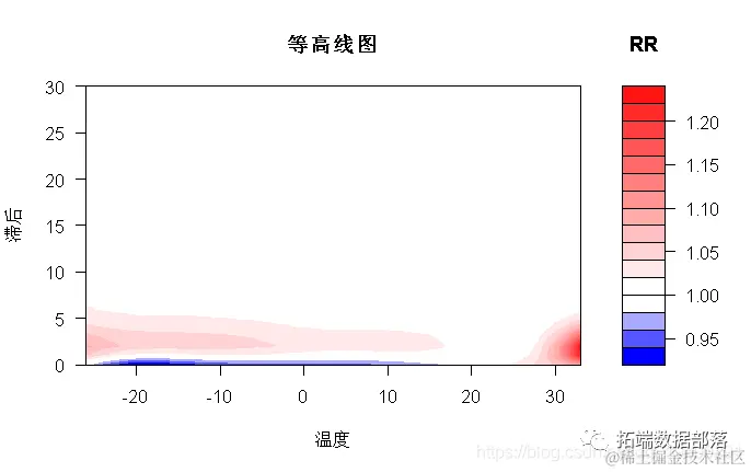 一维或二维关联的解释通过图形表示来辅助。通过方法函数plot(),lines()和points()为类“ crosspred”和“ crossreduce”提供高级和低级绘图功能。例如,我使用对象pred中的预测。plot()方法可以通过参数ptype为“ crosspred”对象生成不同类型的图。具体来说,它会生成整个二维暴露-滞后-反应关联的图形。二维关联可以绘制为3-D或等高线图,例如: