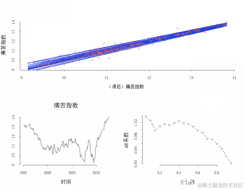 顶部图,拟合线以蓝色叠加。在AR系数恒定的情况下,我们应该得到相互平行的线条,因为唯一的变化是你希望拟合数据。在这种情况下,我们可以在右下角的面板上看到,AR系数不是恒定的。对于拟合低分位数,过程表现得像随机游走,而对于高分位数则观察到强烈的均值回归。这种不对称性表明这个过程是异方差的,低方差比高方差大,所以我们得到的是 "扇形 "图而不是平行线。它的经济意义在于,当这个指数高的时候,要采取措施来压低它。这些措施包括降低借贷成本,从而使陷入困境的公司能够继续生存,使成功的公司能够保持投资水平。重点是,当该指数高时,我们试图压低它,而当它处于中间范围时,它可以双向发展,因此是 "扇形"。