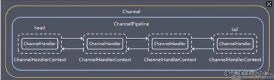 channel中可以创建出一个ChannelPipeline, ChannelPipeline中有维护了一个由ChannelHandlerContext组成的双向链表