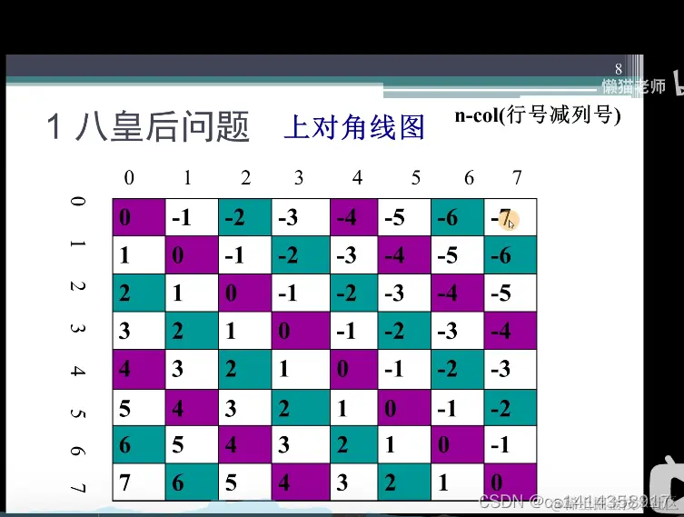//已知具体的一个点,该点所在对角线的点的值都有相同的值 行-列+ 7