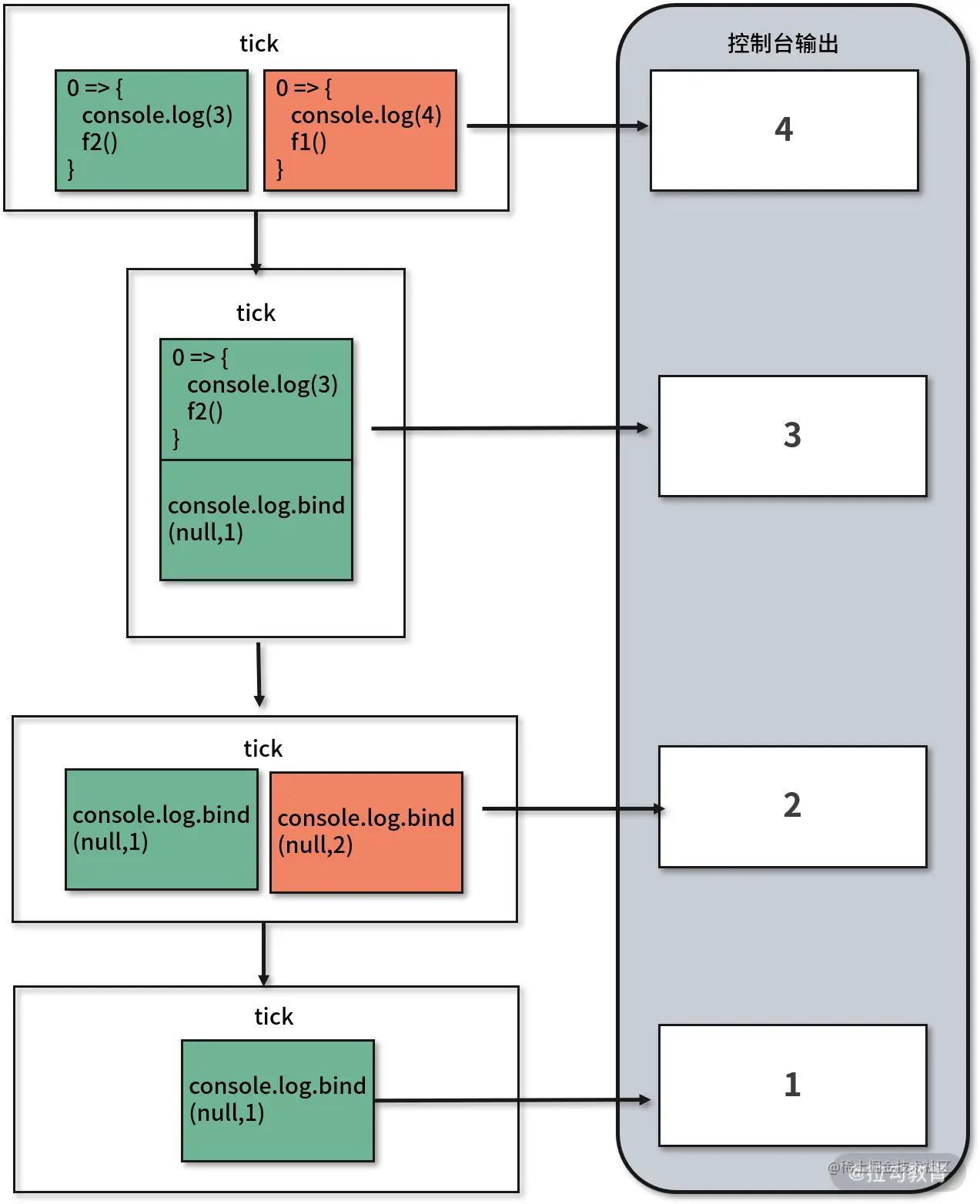 - 第 3 次 tick,调用红色队列中的打印函数,控制台打印数字 2; 第 4 次 tick,调用绿色队列中的打印函数,控制台打印数字 1。