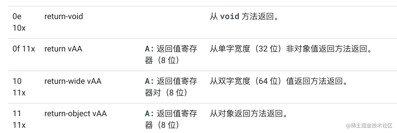 除 return-void 指令以外,其他return指令都附带一个返回值,如下: