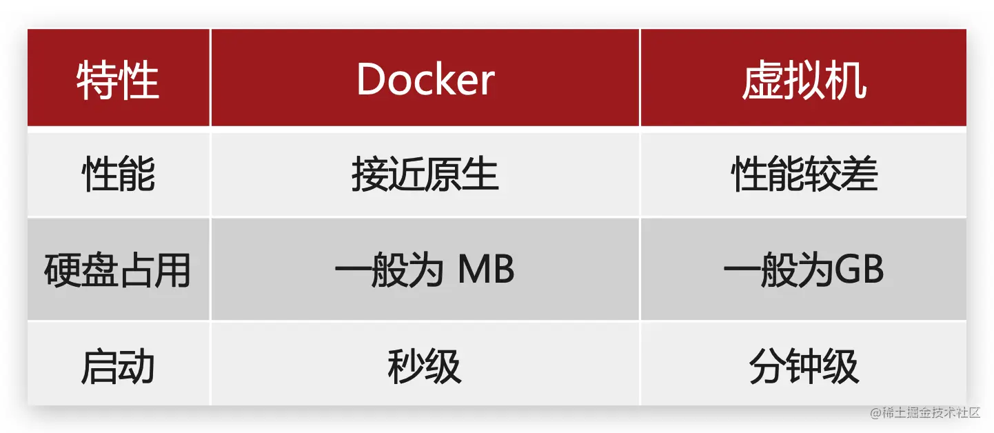docker体积小、启动速度快、性能好;虚拟机体积大、启动速度慢、性能一般
