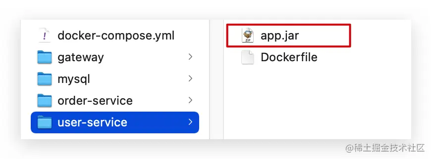 编译打包好的app.jar文件,需要放到Dockerfile的同级目录中。注意:每个微服务的app.jar放到与服务名称对应的目录,别搞错了。
